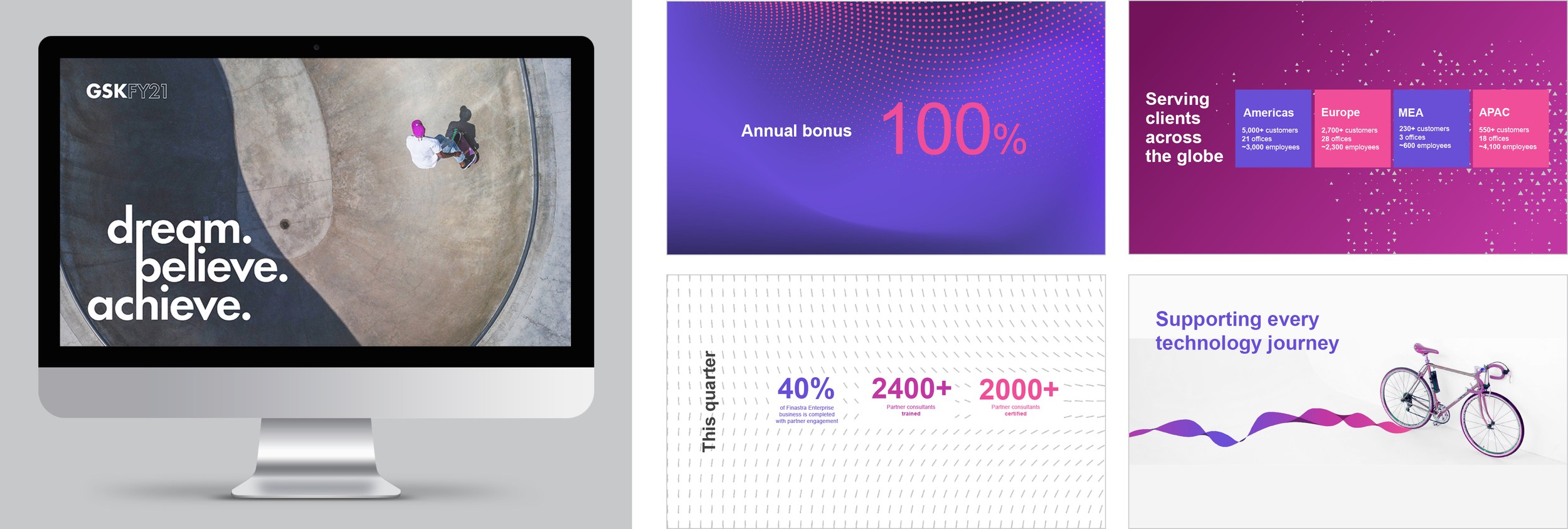 Design delivery from concept to delivery of Finastra’s Global Sales Kickoff (GSK), held virtually. It was the first time this event was held online and was all done at short notice (pivot due to the pandemic). Feedback was overwhelmingly positive.